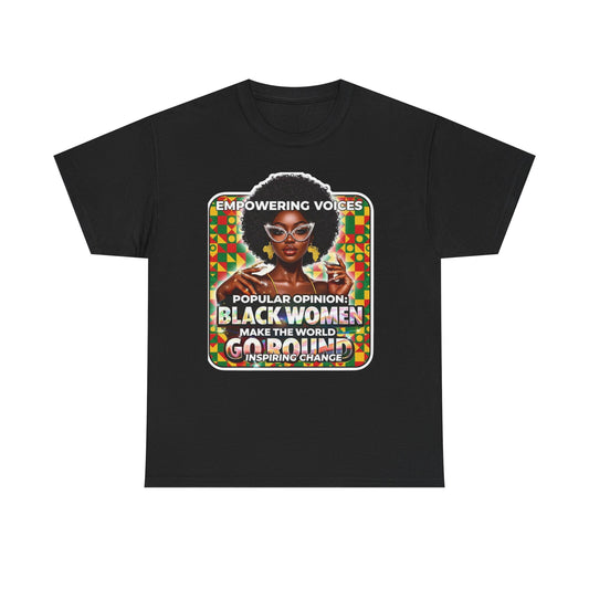 T-Shirt — "Empowering Voices: Popular Opinion — Black Women Make the World Go Round" Retro Afrocentric Design